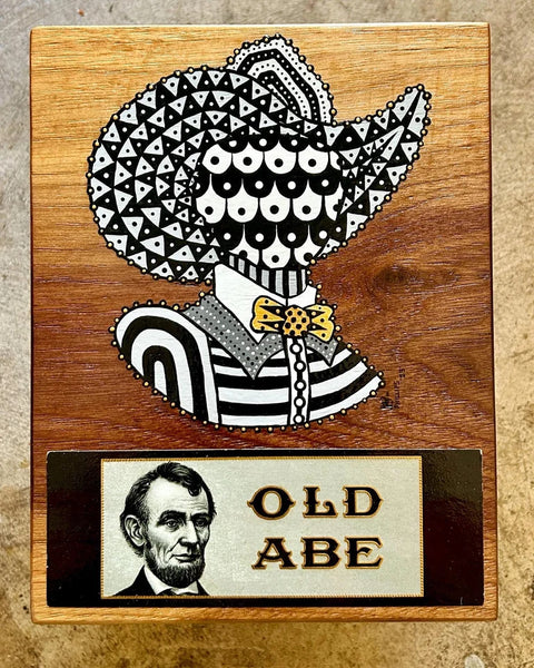 acrylic and vintage outer cigar label (circa 1920's) on salvaged thick walnut cut. Gloss finish.
