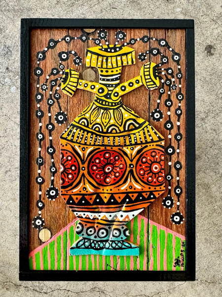 acrylic on cut out latex paint pour, affixed to assemblage of milled down wheel barrow (RIP) handles. Gloss finish.